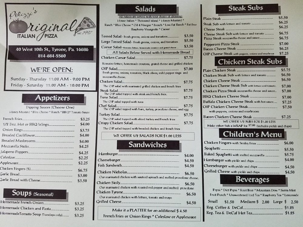 Original Italian Pizza Restaurant, located in Tyrone, PA, is a popular spot offering a variety of delicious Italian dishes. Their menu includes appetizers like breadsticks and wings, salads such as steak and chicken salad, and pasta options like spaghetti with meatballs or chicken parmesan. Customers rave about their baked Italian subs, pizza slices, and homemade rolls. The cozy ambiance and friendly service make it a great option for lunch or dinner. Many vegetarian options are available, and they offer delivery, takeout, and catering services. The authentic flavors and warm atmosphere at Original Italian Pizza Restaurant make it a must-visit for Italian cuisine lovers.